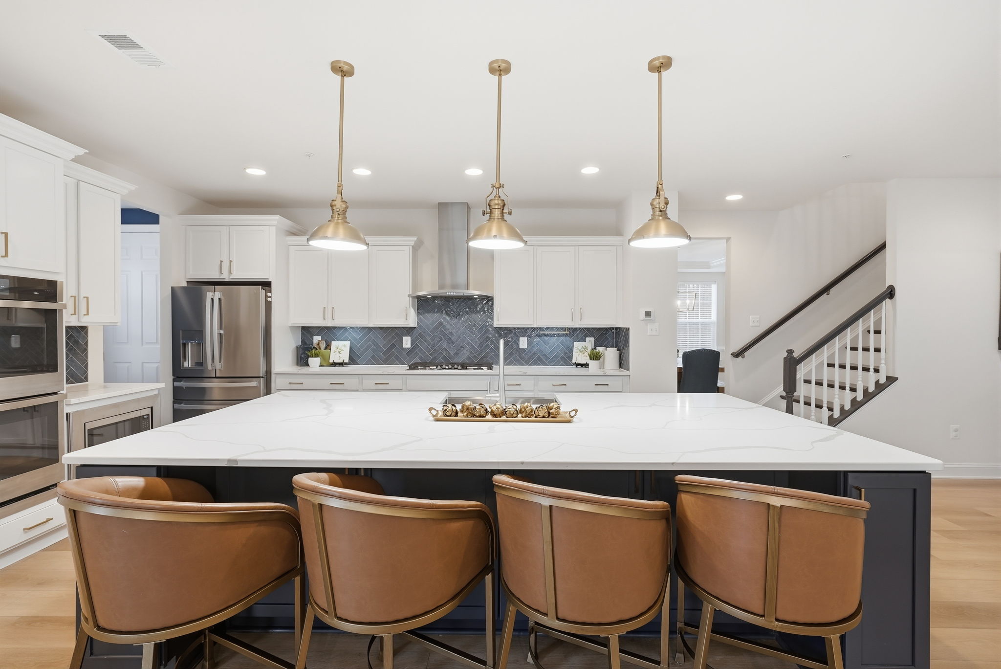 Stunning stone-front home tucked away on a quiet cul-de-sac, showcasing exceptional curb appeal with professionally landscaped grounds and elegant exterior lighting that creates a striking presence both day and night. A spacious two-car garage completes the impressive exterior. Step inside to a grand two-story foyer highlighted by a dramatic waterfall staircase with modern contrasting finishes, setting the tone for the refined design throughout. The thoughtfully designed main level features a private office, formal living room, and dining room, offering both versatility and timeless appeal for everyday living and entertaining. At the heart of the home, a breathtaking two-story family room is filled with natural light from expansive windows and anchored by a stunning fireplace. This impressive space flows seamlessly into the gourmet kitchen, creating an open and inviting layout ideal for gathering. The gourmet kitchen is designed to impress, featuring a large quartz island with seating, stainless steel appliances, custom cabinetry, and designer pendant lighting. The open-concept design connects effortlessly to the main living areas, while a custom mudroom adds both convenience and functionality. Upstairs, four spacious bedrooms include a luxurious primary suite with a tray ceiling, custom walk-in closet, and a spa-inspired bath complete with dual vanities, a soaking tub, and an upgraded walk-in shower with custom tilework and built-in seating. A secondary bedroom suite with its own full bathroom provides added flexibility, ideal for guests or extended living arrangements, while a buddy bathroom enhances convenience for additional bedrooms. The fully finished basement expands the living space with a large recreation area, dedicated exercise room, and additional storage. Outdoor living is equally impressive, featuring a stamped concrete patio with a built-in circular fire pit and raised stone seating wall, perfect for entertaining. An expansive composite deck overlooks a private wooded backdrop with mature trees, offering both privacy and tranquility, while outdoor lighting enhances the ambiance into the evening. With 9-foot ceilings on all levels, energy-efficient systems, and quality craftsmanship throughout, this home offers a perfect blend of luxury, space, and functionality in a highly desirable location near commuter routes, shopping, dining, and everyday conveniences.